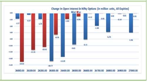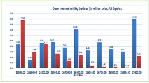 Highest OI build-up is seen at 27000 strike Calls and 26000 strike Puts, to the tune of 17.85mn and 17.40mn respectively.