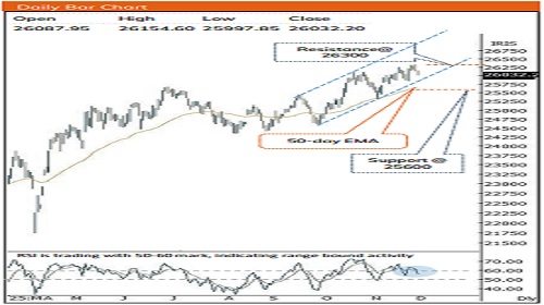 * A key observation is that, after hitting fresh all-time highs, the index is undergoing a healthy two-session profit-booking phase, retracing back towards its immediate support zone near the 20-day EMA at ~25,950, which aligns with the trendline support around 25,900, offering a strong confluence of support. Despite the near-term pullback, the weekly chart structure remains constructive, with the index firmly maintaining its higher-high, higher-low formation. Going forward, a decisive close above the previous session’s high of 26,154 would signal a pause in the current corrective move. Failure to surpass this level could keep the index in a consolidation range between (26300-25600) in the near term.