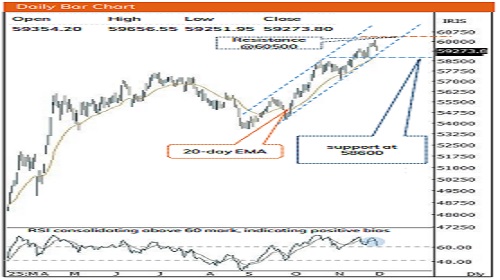 * Bank Nifty continues to undergo a healthy retracement following a sharp two-week rally of nearly 2,950 points, which pushed the Stochastic indicator into overbought territory on the monthly time frame. The current sideways-to-downward corrective structure has brought the index closer to its previous swing low (58900), which aligns with the 20-day EMA, creating a strong confluence of support Given this backdrop, traders are advised to avoid aggressive long positions at elevated levels. Instead, a buy-on-dips approach is preferred to accumulate fundamentally strong banking names, particularly those that delivered robust Q2 earnings. Immediate support is placed near 58,600, which also coincides with the 50% retracement of the recent upmove from (57157-60114)