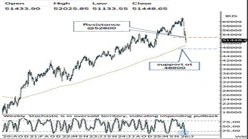 * Index is likely to open Gap-down on back of geopolitical cues and rise in Brent crude prices. Key highlight is that since onset of IranUS/Israel conflict the index have made multiple pullback attempts, but failed to build the momentum above its short-term moving (10- day EMA) placed at 52800. Going ahead, for a meaningful pullback to materialize Index needs to close and sustain above short-term moving average (52800) that would further extend pullback towards 54200 being recent swing high and 61.8% retracement of recent decline from (57097-50105). Meanwhile, strong support is placed at 48800 (being the 200-week EMA).