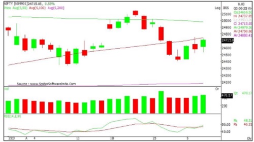 Action: Nifty has an immediate Resistance at 24800 and on a decisive close above expect a rise to 24870-24940 levels.