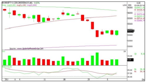 Bank Nifty’s next immediate resistance is around 54600 levels on the upside and on a decisive close above expect a rise to 54840-55000. There is an immediate support at 54130-53870 levels.