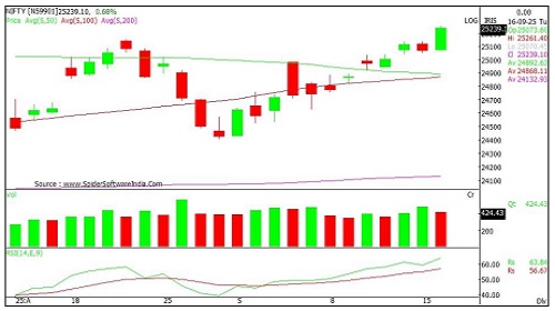 Action: Nifty has an immediate Resistance at 25300 and on a decisive close above expect a rise to 25370-25440 levels.