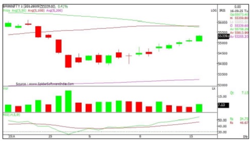 Bank Nifty’s next immediate resistance is around 55570 levels on the upside and on a decisive close above expect a rise to 55800-56000. There is an immediate support at 55100-54870 levels.