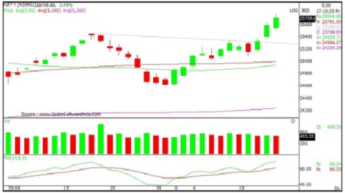 Nifty is expected to open on a gap up note and likely to witness positive move during the day. On technical grounds, Nifty has an immediate Resistance at 25820. If Nifty closes above that, further upside can be expected towards 25940 -26100 mark. On the flip side 25550-25390 will act as strong support levels. The ‘three white soldiers’ candlestick pattern suggests that buyers are gaining control and taking the market in an upward direction.