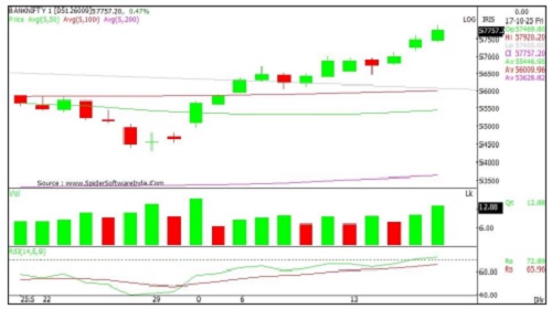Bank Nifty’s next immediate resistance is around 57980 levels on the upside and on a decisive close above expect a rise to 58210-58470. There is an immediate support at 57460-57170 levels.
