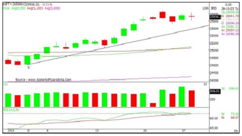 Nifty is expected to open on a positive note and likely to witness positive move during the day. On technical grounds, Nifty has an immediate Resistance at 26050. If Nifty closes above that, further upside can be expected towards 26160-26280 mark. On the flip side 25820-25700 will act as strong support levels. Formation of a Doji candle on daily timeframe, with bias maintained as cautiously positive.