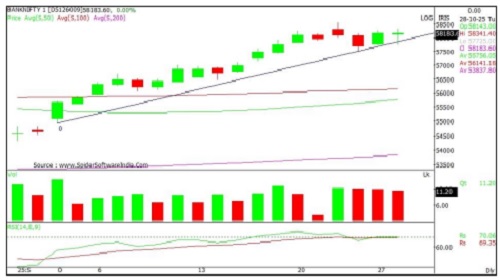 Bank Nifty’s next immediate resistance is around 58440 levels on the upside and on a decisive close above expect a rise to 58700-58900. There is an immediate support at 57830-57470 levels.