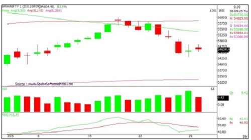 Bank Nifty’s next immediate support is around 54400 levels on the downside and on a decisive close below expect a fall to 54140-53900. There is an immediate resistance at 54870-55100 levels.