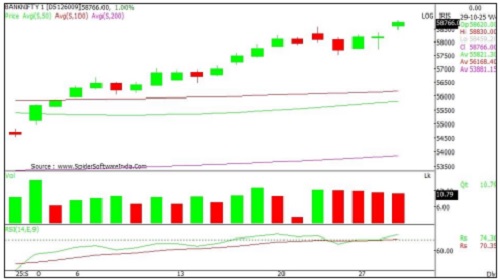 Bank Nifty’s next immediate support is around 58540 levels on the downside and on a decisive close below expect a fall to 58320-58170. There is an immediate resistance at 58900-59050 levels.