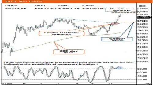 * Key point to highlight is that the index has witnessed profit booking after a sharp 7% rally, however, index continues to maintain its higher-highlow structure for the fifth-consecutive session, indicating a healthy pause in the ongoing uptrend that will make index healthy. The stochastic oscillator on weekly chart has entered into overbought territory at 91, indicating temporary breather at higher levels cannot be ruled out. Hence, one should adopt a buy-on-dips strategy with immediate support placed near 56,800 representing the 38.2% retracement of the ongoing up move (54,226-58,261) and 20-day EMA.