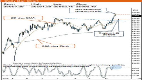 * Key point to highlight is that, Nifty has rallied >1500 points in last four weeks that hauled index in overbought territory, indicating possibility of temporary breather cannot be ruled out. However, such a breather should not be construed as negative, instead use dips to accumulate quality stocks with strong earnings as strong support is placed at 25400. Nifty reclaimed 26000 mark after twelve months of hiatus wherein in absorbed host of negative news around geopolitical issues, Tariff uncertainties, FII's sell-off, indicating revival in market sentiment amid trade deal development.