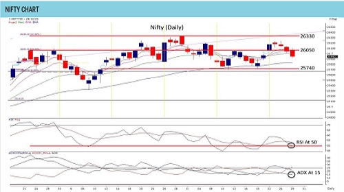Nifty has closed below its short term moving average of 14 and 21 EMA showing weakness. A sustained follow-through above 26330 would significantly strengthen the ongoing uptrend. On the downside, the 25800 zone remains a critical support to preserve trend strength. While a decisive breakout above 26220 would reinstate the pathway toward 26330, a breakdown below 25800 would weaken the setup and expose the index to corrective pressure. Given the prevailing technical configuration, traders may consider trimming fresh long positions and wait for corrective trend to take support near its upward trend line around 25800. Breach below 25800, could open doors till 25500 and 25250.