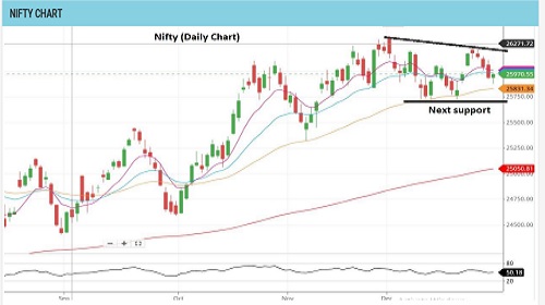 Nifty has closed below its short term moving average of 14 and 21 EMA showing weakness. This week due to low volume and holiday season, we don’t expect any significant movement in Index and stock specific movement can be witnessed. Any significant upside can only be considered above 26300. On the downside, the 25900 zone remains a critical support to preserve trend strength. While a decisive breakout above 26250 would reinstate the pathway toward 26330, a breakdown below 25900 would weaken the setup and expose the index to corrective pressure till 25720. Given the prevailing technical configuration, traders may consider trimming any fresh long positions or hold their longs with stoploss of 25900.