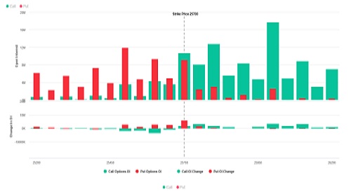 * Call writing is seen at 25750 then 25700 strike while Put writing is seen at 25700 then 25600 strike.