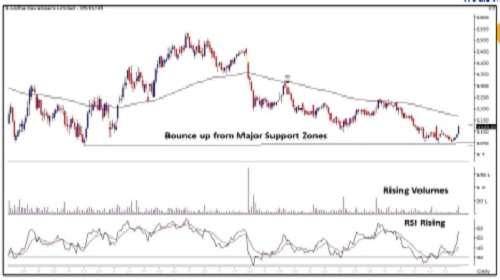 * Stock has bounced up from its major support zones.