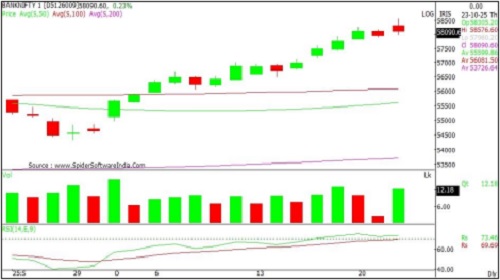 Bank Nifty’s next immediate resistance is around 58450 levels on the upside and on a decisive close above expect a rise to 58600-58840. There is an immediate support at 57860-57620 levels.