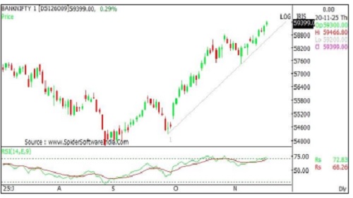 Bank Nifty’s next immediate support is around 59240 levels on the downside and on a decisive close below expect a fall to 59100-58980. There is an immediate resistance at 59500-59620 levels.