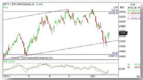 • On technical grounds, Nifty has an immediate support at 25340. If Nifty closes below that, further downside can be expected towards 25270-25200 mark.