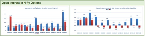 Highest OI build-up is seen at 26000 strike Calls and 25000 strike Puts, to the tune of 22.64mn and 16.89mn respectively.