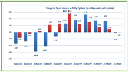 Highest OI build-up is seen at 26000 strike Calls and 26000 strike Puts, to the tune of 24.67mn and 18.27mn respectively.