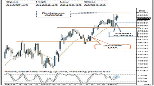 * We believe, volatility is likely to remain elevated on the backdrop of geopolitical uncertainty. Therefore, any corrective declines from current levels should be viewed as buying opportunities as strong demand zone is identified near 59,700, being 50-day EMA and 61.8% retracement of the current up move (57,783-61,674). A breach below 59700 support would lead to extended correction 59300 levels