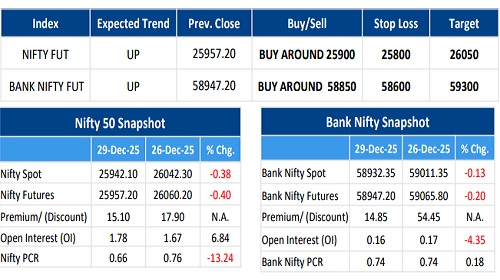 * Amongst the Nifty options (30-Dec Expiry), Call writing is seen at 26000-26100 levels, indicating Nifty is likely to find strong resistance in the vicinity of 26000-26100 levels. On the lower side, an immediate support is placed in the vicinity of 25800-25900 levels where we have seen Put writing.