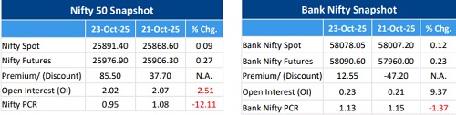 * Amongst the Nifty options (28-Oct Expiry), Call writing is seen at 26100-26200 levels, indicating Nifty is likely to find strong resistance in the vicinity of 26100-26200 levels. On the lower side, an immediate support is placed in the vicinity of 25800-25700 levels where we have seen Put writing.