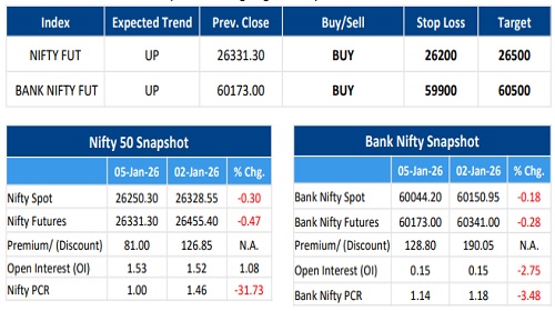 * Amongst the Nifty options (06-Jan Expiry), Call writing is seen at 26400-26500 levels, indicating Nifty is likely to find strong resistance in the vicinity of 26400-26500 levels. On the lower side, an immediate support is placed in the vicinity of 26100-26200 levels where we have seen Put writing.