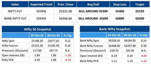 * Amongst the Nifty options (14-Oct Expiry), Call writing is seen at 25300-25400 levels, indicating Nifty is likely to find strong resistance in the vicinity of 25300-25400 levels. On the lower side, an immediate support is placed in the vicinity of 25200-25100 levels where we have seen Put writing.