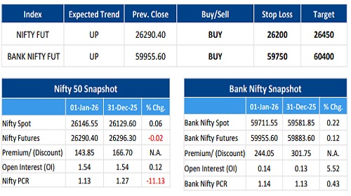 * Amongst the Nifty options (06-Jan Expiry), Call writing is seen at 26400-26500 levels, indicating Nifty is likely to find strong resistance in the vicinity of 26400-26500 levels. On the lower side, an immediate support is placed in the vicinity of 26200-26300 levels where we have seen Put writing.