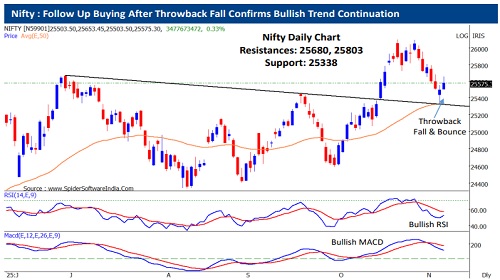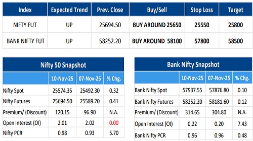 * Amongst the Nifty options (11-Nov Expiry), Call writing is seen at 25700-25800 levels, indicating Nifty is likely to find strong resistance in the vicinity of 25700-25800 levels. On the lower side, an immediate support is placed in the vicinity of 25500-25600 levels where we have seen Put writing.