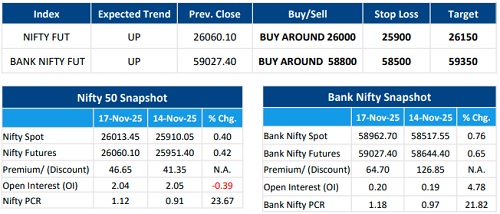 * Amongst the Nifty options (18-Nov Expiry), Call writing is seen at 26100-26200 levels, indicating Nifty is likely to find strong resistance in the vicinity of 26100-26200 levels. On the lower side, an immediate support is placed in the vicinity of 25800-25900 levels where we have seen Put writing.
