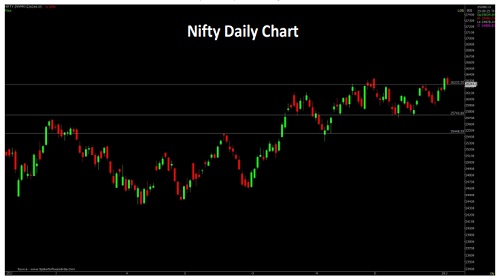 Nifty opened on a flat note but witnessed buying momentum in the first half however selling in the second half led the index lower toclosenear day's low. Nifty closed at 26250 with a loss of 78 points. On the daily chart the index has formed a small Bearish candle withshadowsoneither side indicating indecisiveness amongst participants regarding the direction. The chart pattern suggests that if Nifty crosses andsustainsabove 26260 level it would witness buying which would lead the index towards 26400-26500 levels. Important Supports for the dayisaround26180 However if index sustains below 26180 then it may witness profit booking which would take the index towards 26050-25950levels.