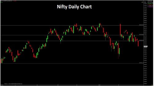 Nifty opened with a downward gap and selling pressure throughout the session dragged it lower to end negative . Nifty closed at 25179withaloss of 318 points. On the daily chart the index has formed a long Bearish candle forming lower High-Low compare to previous sessionindicatingnegative bias. The chart pattern suggests that if Nifty breaks and sustains below 25140 level it would witness selling which wouldleadtheindextowards 25100-25000 levels. However, if index crosses above 25250 level it would witness pullback rally which would take the indextowards25350-25400.