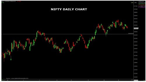 Nifty opened on a flat note and remained in a small range throughout the day. Nifty closed at 25819 with a loss of 42 points. Onthedailychartthe index has formed a small Bearish candle with shadows on either side indicating indecisiveness amongst participants regarding thedirection.The chart pattern suggests that if Nifty crosses and sustains above 25950 level it would witness buying which would lead the indextowards26050-26150 levels. Important Supports for the day is around 25800 However if index sustains below 25800 then it may witness profit bookingwhich would take the index towards 25760-25700 levels.