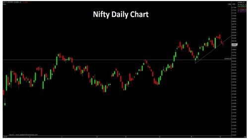 Nifty opened on a flat note and traded with extreme volatility on either side to end on a negative note. Nifty closed at 25986 withalossof46points. On the daily chart the index has formed a small Bearish candle with shadows on either side indicating indecisiveness amongstparticipants regarding the direction. The chart pattern suggests that if Nifty crosses and sustains above 26070 level it would witnessbuyingwhich would lead the index towards 26200-26300 levels. Important Supports for the day is around 25900 However if index sustainsbelow25900 then it may witness profit booking which would take the index towards 25800-25740 levels.