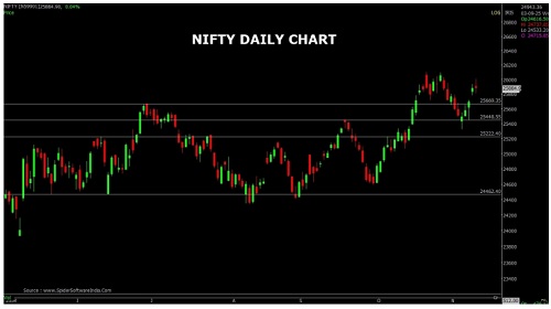 Nifty opened on a flat note and witnessed extreme volatality on eitherside for most part of the session. Nifty closed at 25885 withagainof9points. On the daily chart the index has formed a bearish candle with shadows on either side representing extreme volatilityaswell asindecisiveness amongst participants regarding the direction. The chart pattern suggests that if Nifty crosses and sustains above 25950level itwould witness buying which would lead the index towards 26000-26100 levels. Important Supports for the day is around 25780Howeverifindex sustains below 25780 then it may witness profit booking which would take the index towards 25700-25600 levels.
