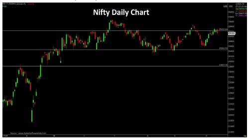Nifty opened on a flat note but selling led the index downwards to end in red. Nifty closed at 25146 with a loss of 82 points. Onthedailychartthe index has formed a small Bearish candle with lower shadow indicating buying support at lower levels. The chart pattern suggeststhatifNifty breaks and sustains below 25050 level it would witness selling which would lead the index towards 25000-24900 levels. However, if indexcrosses above 25200 level it would witness pullback rally which would take the index towards 25300-25350.