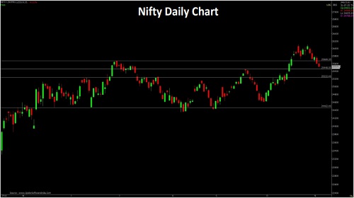 Nifty opened on a flat note but selling led the index downwards to end near the low of the day. Nifty closed at 25510 with a loss of 88points.On the daily chart the index has formed a small Bearish candle with upper shadow indicating selling pressure as well as resistanceat higherlevels. The chart pattern suggests that if Nifty breaks and sustains below 25490 level it would witness selling which would leadtheindextowards 25450-25400 levels. However, if index crosses above 25580 level it would witness pullback rally which would take the indextowards25680-25750.