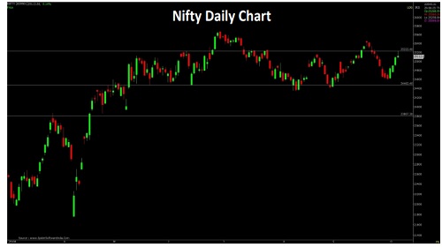 Nifty opened on a positive note and extended buying momentum in the first half however selling in the second half led the indexlowertoclose near day's low. Nifty closed at 25108 with a gain of 31 points. On the daily chart the index has formed a Bullish candle withanuppershadow indicating selling at higher levels. The chart pattern suggests that if Nifty breaks and sustains below 25070 level it wouldwitnesssellingwhich would lead the index towards 25000-24800 levels. However, if index crosses above 25200 level it would witness pullbackrallywhichwould take the index towards 25250-25300.