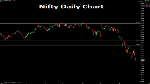 Nifty opened with a downward gap and selling pressure throughout the session dragged it lower to end negative. Nifty closed at 22331 with a loss of 488 points. On the daily chart the index has formed a bearish candle with shadows on either side representing extreme volatility as well as indecisiveness amongst participants regarding the direction. The chart pattern suggests that if Nifty breaks and sustains below 22300 level it would witness selling which would lead the index towards 22180-22100 levels. However, if index crosses above 22550 level it would witness pullback rally which would take the index towards 22710-22820.