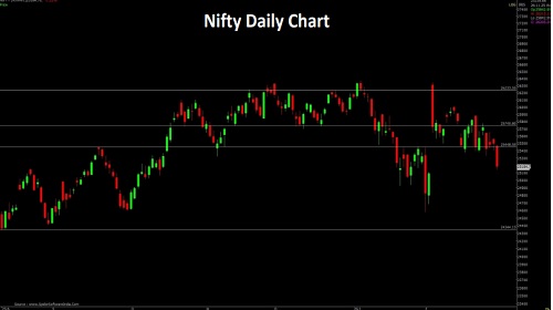 Nifty opened with a downward gap and selling pressure throughout the session dragged it lower to end negative . Nifty closed at 25179withaloss of 318 points. On the daily chart the index has formed a long Bearish candle forming lower High-Low compare to previous sessionindicatingnegative bias. The chart pattern suggests that if Nifty breaks and sustains below 25140 level it would witness selling which wouldleadtheindextowards 25100-25000 levels. However, if index crosses above 25250 level it would witness pullback rally which would take the indextowards25350-25400.