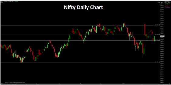 Nifty opened with a downward gap however buying momentum at lower levels pulled index higher to end near day's high. Nifty closedat 25683with a gain of 212 points. On the daily chart the index has formed a Bullish candle which has totally Engulfed its previous day's moveforminga"Bullish Engulfing" candlestick formation which is a bullish reversal formation. For such formation confirmation is necessary, soif theindexbreaks above previous day's high it would witness a change of trend to the upside. The chart pattern suggests that if Nifty crosses andsustainsabove 25700 level it would witness buying which would lead the index towards 25760-25850 levels. Important Supports for the dayisaround25560 However if index sustains below 25560 then it may witness profit booking which would take the index towards 25500-25400levels.
