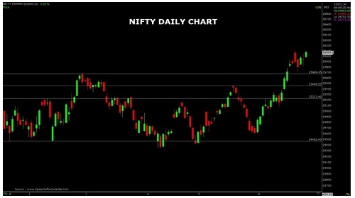 Nifty opened with an upward gap and remained in positive terrain throughout the day. Nifty closed at 26069 with a gain of 133 points. Onthedaily chart the index has formed a Bullish candle with a upper shadow indicating selling at higher levels. The chart pattern suggests that if Niftycrosses and sustains above 26100 level it would witness buying which would lead the index towards 26200-26300 levels. Important Supportsforthe day is around 26000 However if index sustains below 26000 then it may witness profit booking which would take the index towards25900-25800 levels.