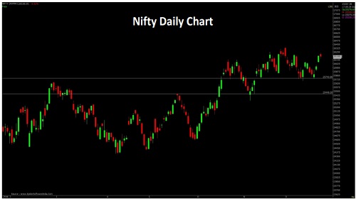 Nifty opened with an upward gap and remained lackluster within narrow trading range throughout the day. Nifty closed at 26177withagainof5 points. On the daily chart the index has formed a small Bearish candle with shadows on either side indicating indecisiveness amongstparticipants regarding the direction. The chart pattern suggests that if Nifty crosses and sustains above 26220 level it would witnessbuyingwhich would lead the index towards 26270-26350 levels. Important Supports for the day is around 26120 However if index sustainsbelow26120 then it may witness profit booking which would take the index towards 26060-25950 levels.