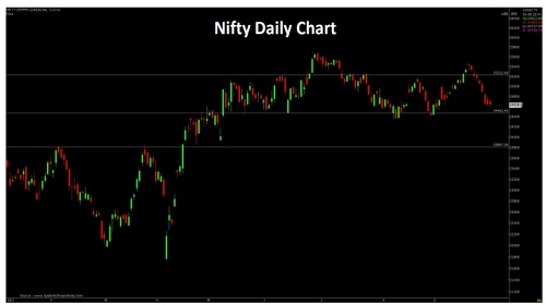 Nifty opened with an upward gap but witnessed selling from the opening tick to end near the day's low. Nifty closed at 24611 withalossof24points. On the daily chart index has formed a small bearish candle forming lower High-Low compare to previous session and has closedbelowprevious session's low indicating negative bias. The chart pattern suggests that if Nifty breaks and sustains below 24580 level it wouldwitnessselling which would lead the index towards 24500-24450 levels. However, if index crosses above 24732 level it would witness pullbackrallywhich would take the index towards 24790-24860.