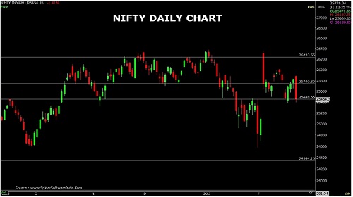 Nifty opened with an upward gap but witnessed selling from the opening tick to end near the day's low. Nifty closed at 25454 withalossof365points. On the daily chart the index has formed a Bearish candle which has totally Engulfed its previous day's move forminga"BearishEngulfing" candlestick formation which is a bearish reversal formation. For such formations confirmation is necessary, so if theindexbreaksbelow previous day's low it would witness a change of trend to the downside. The chart pattern suggests that if Nifty crosses andsustainsabove25650 level it would witness buying which would lead the index towards 25750-25850 levels. Important Supports for the day is around25370However if index sustains below 25370 then it may witness profit booking which would take the index towards 25300-25250 levels.