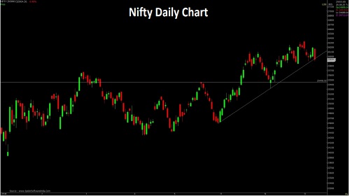 Nifty opened with downward gap and extended its down move in initial hours making day low around 25728. However, buying support at lowerlevels recovered most of the earlier losses to end near day's high.. Nifty closed at 25840 with a loss of 121 points. On the daily chart theindexhas formed a Bearish candle with long lower shadow indicating buying support at lower levels. The chart pattern suggests that if Niftycrossesand sustains above 25925 level it would witness buying which would lead the index towards 26000-26120 levels. Important Supports for thedayis around 25728 However if index sustains below 25728 then it may witness profit booking which would take the index towards 25650-25600levels.