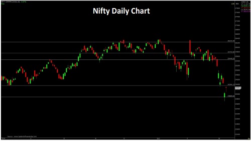 Nifty opened on a flat note but selling led the index downwards to end in red. Nifty closed at 23867 with a loss of 395 points. Onthedailychartthe index has formed a long Bearish candle forming lower High-Low compare to previous session indicating negative bias. The chart patternsuggests that if Nifty breaks and sustains below 23830 level it would witness selling which would lead the index towards 23750-23700levels.However, if index crosses above 24000 level it would witness pullback rally which would take the index towards